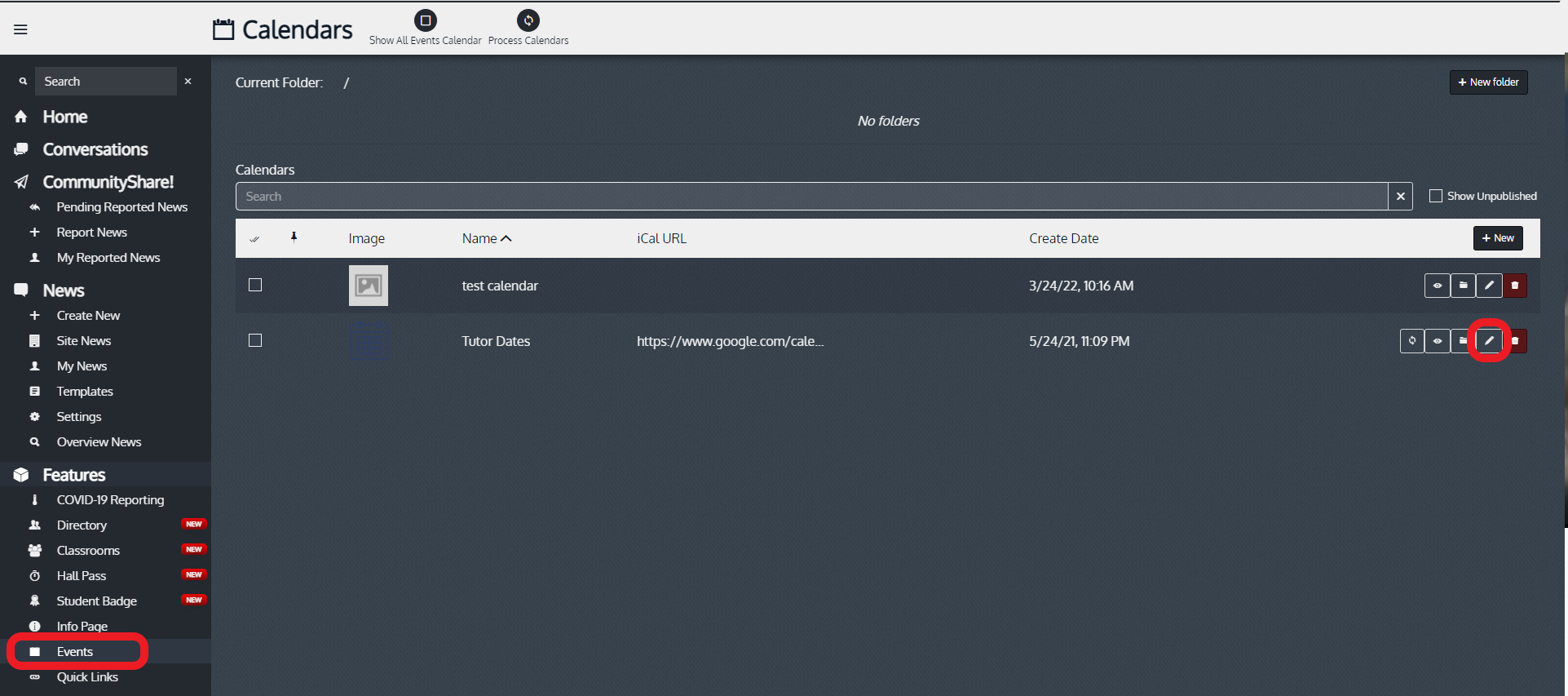 Locate on the Dashboard navigate to "Features" > "Events" > click the "Edit" pen icon for the calendar you need to edit.