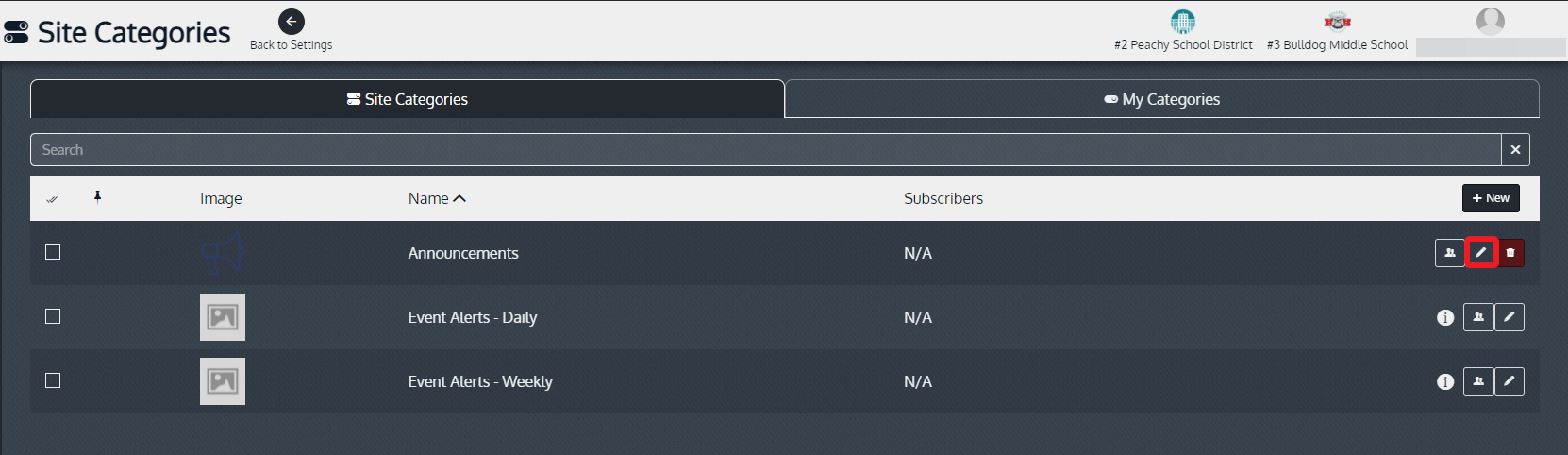 Edit Site Categories in News Settings