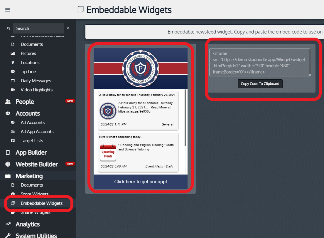 Step 3: Click on "Store Widgets" to find the codes for Apple, Google, and the Web Version of the App. Use the "Copy to Clipboard" function and place wherever you need it.